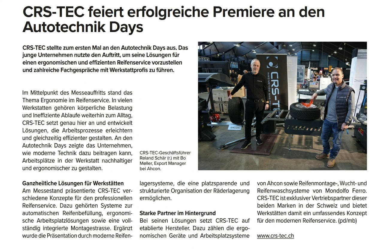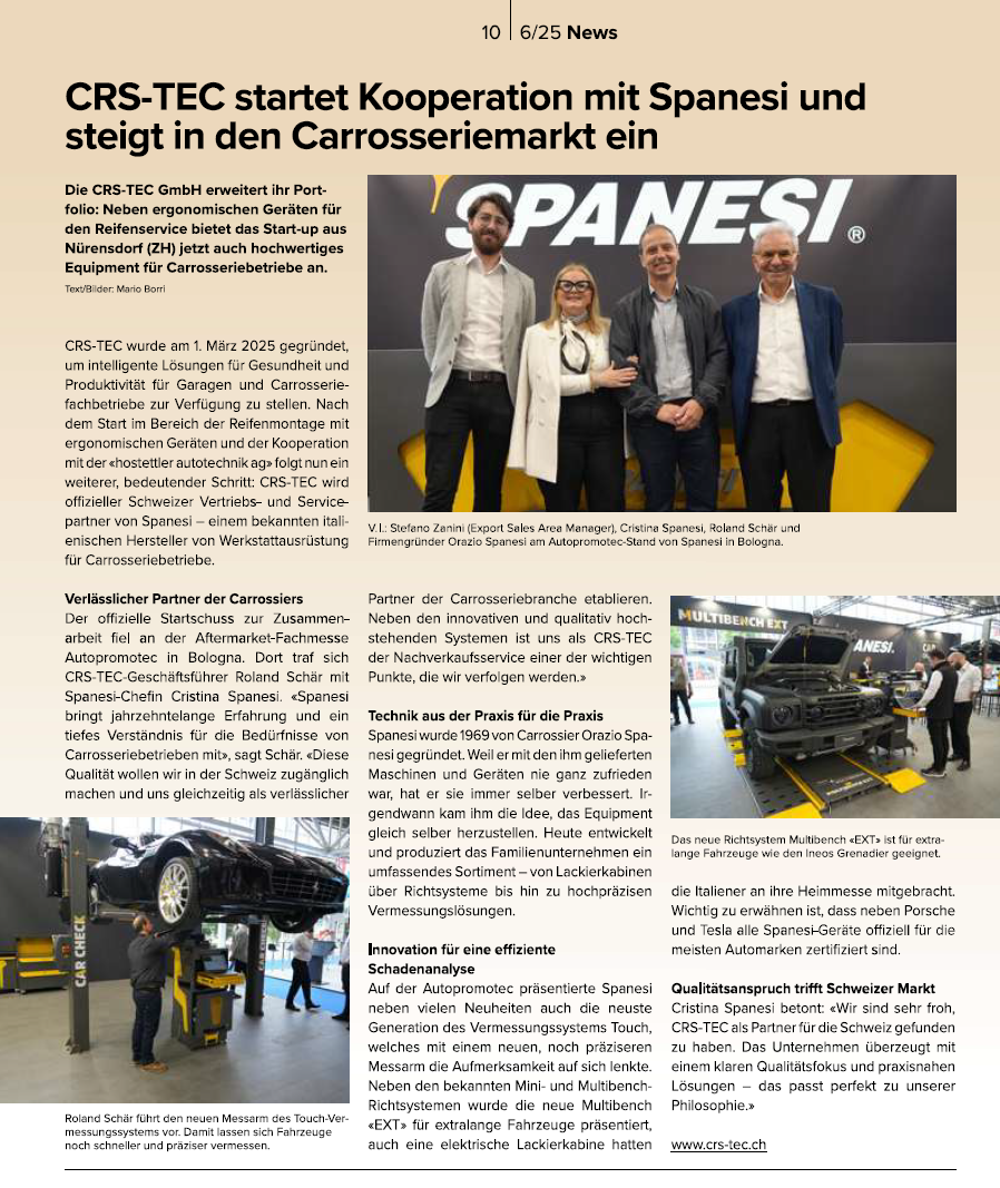 CRS-TEC, ist ein dynamisches Unternehmen, dass sich auf effiziente und ergonomische Lösungen für den Garagen-, Reifenservice- und Carrosserie-Sektor spezialisiert hat.