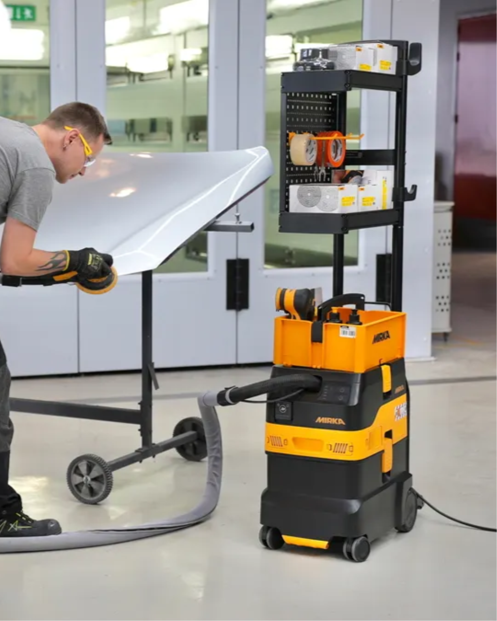 Rangement des abrasifs : deux étagères offrent chacune de la place pour 3 boîtes contenant des disques abrasifs de 150 mm (6 boîtes au total)